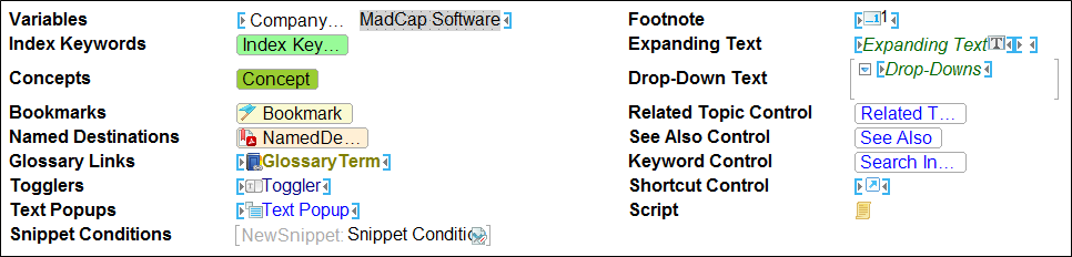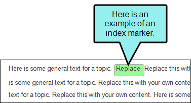 A marker is a highlighted "flag" that shows the insertion of certain features. For example, if inserted elements such as variables, bookmarks, index keywords, or concepts exist in topics, markers indicate where they have been added.