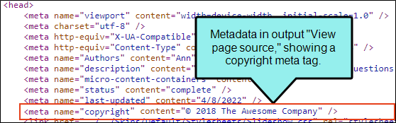 Example A company wants its online technical documentation to include a copyright tag in the metadata. They simply want to add a layer of protection and record the fact that all the text, images, and other content are owned by the company.