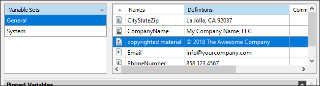 • Content Management In Flare Desktop's dynamic reports (in the Analysis ribbon), you can open the Used Meta Tags or Used Variables window panes to see copyright metadata display in each, indicating that the metadata is applied at the project level.