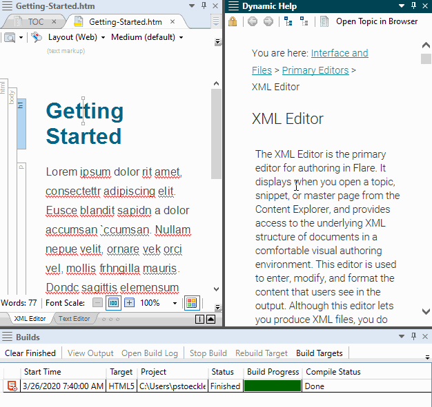 If you want to create dynamic Help for your own product(s), the process is essentially the same as it is for context-sensitive Help (CSH) in general. Work with your developer to come up with a plan. As the author, your job is still to create CSH IDs and link them to topics the same way you normally would, and make sure your developer uses the appropriate IDs wherever CSH is needed. The difference is that your developer might need to integrate a window pane in the software to display your Help output (if that is not being done already). Then, other parts of the product's interface (e.g., entire window panes) would be programmed to make the CSH call when a user clicks any part of it, as opposed to, say, clicking an isolated button.