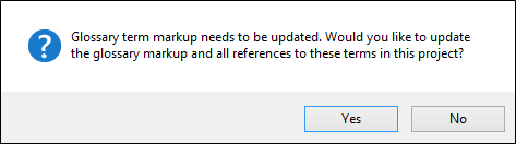 If you created a project with a previous version of Flare Desktop and then open a glossary in a recent version of Flare Desktop, you will be prompted to update the glossary and all content files containing related glossary term links.