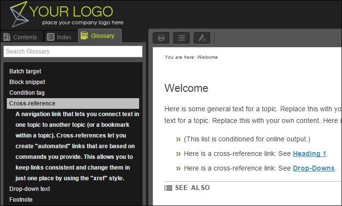 - In HTML5 Top Navigation and Side Navigation outputs, glossary terms and definitions are integrated into search results. See Search and Glossaries in HTML5 Output.