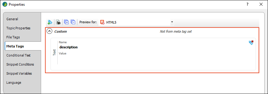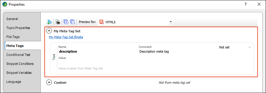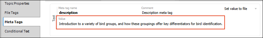 Description meta tags contain brief summaries of web pages and are recognized by all major search engines. These tags might not factor into the search rankings by all search engines, but they are still useful for search engine optimization in web-based outputs, because they can help with the click-through rate in HTML5 output. We recommend that you create a meta tag set file, which adds an empty description meta tag by default. This is faster than adding it separately to each topic. This meta tag then becomes available at lower file levels (including topics), and you can then provide the value in the topic properties.
