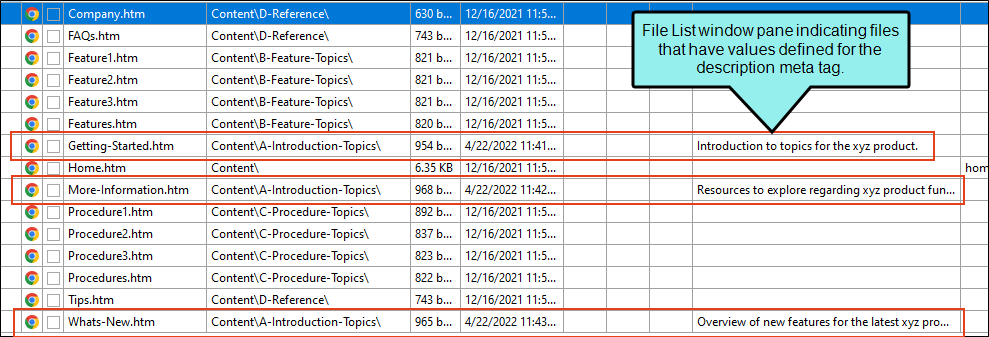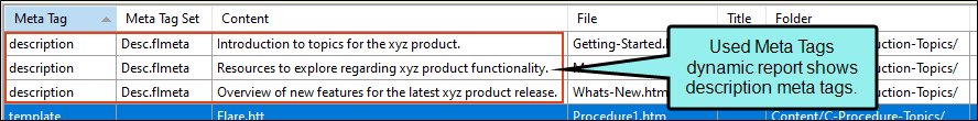 • Content Management In Flare Desktop, you might rely on the Used Meta Tags analysis report or the File List window pane to view a list of files that show the description tags used and their definitions.