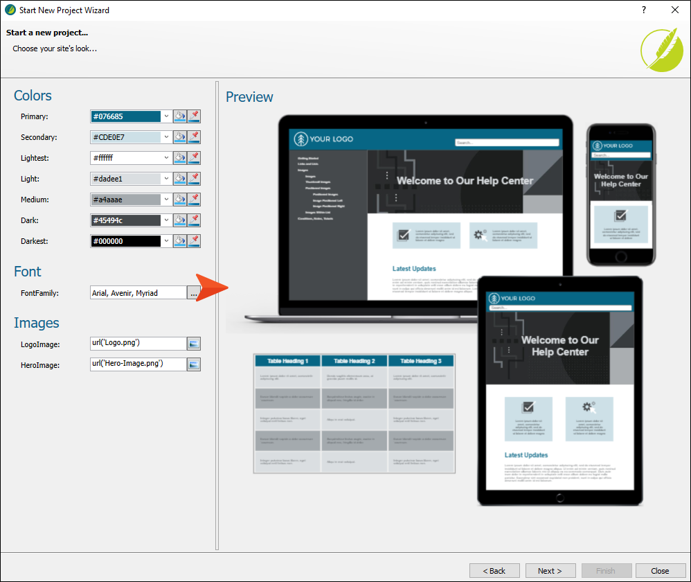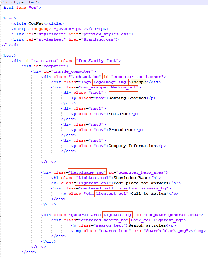 These relate to the properties in the Branding-Template.xml file, and to the branding CSS variables that will become part of a new Flare project created from the custom project template. For example, perhaps there is an area of your preview web page that is currently using Primary_bg. It will therefore display the color associated with the Primary CSS variable in the project. But you could edit this to something else, such as Secondary_bg. And in that case, this section of the preview web page will use the color from the Secondary CSS variable instead.