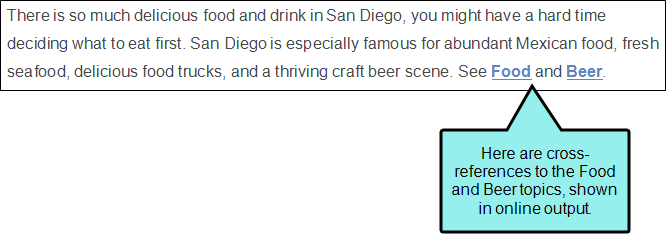 It is fairly common to link to other topics in a project. One way to link between topics is a cross-reference. You may have noticed some cross-references in this tutorial already.
