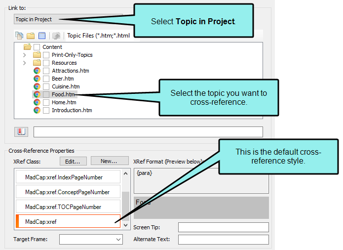 Another common way to insert cross-references is using drag-and-drop. This method automatically uses the main MadCap:xref style, so if you don't need to choose a different style, this is a good way to insert a cross-reference.
