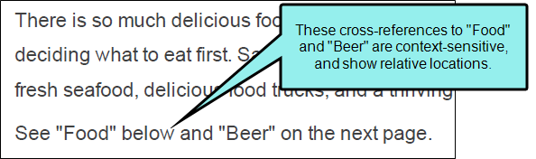 A benefit of using a cross-reference over a standard hyperlink is that cross-references use format commands to update the link automatically. Format commands allow you to tell the cross-reference to provide page number information, the title of the topic, or even a file path.