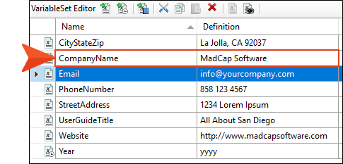 The name of each variable appears in the Name column. The content that will appear in the output wherever the variable is used appears in the Definition column. Let's edit some of the variable definitions.