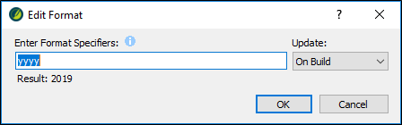 . This indicates that it is a Date/Time variable, which uses format specifiers to represent the date or time. The Year variable uses the format "yyyy" to represent the current year (in 4-digit format). For more information about how to format and use Date/Time variables, see Creating Custom Date/Time Variables.