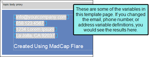 Example After you finish renaming variables, you can look at them in a content file (topic, snippet, template page, page layout). Open the Content Explorer, then expand Resources > TemplatePages folder. Double-click Home-Page.flmsp.