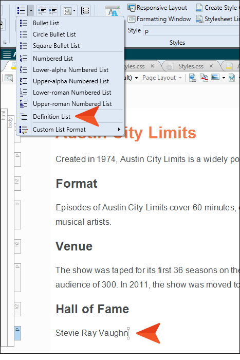 and select Definition List.The text is placed in a <dt> tag, which in turn is placed inside a <dl> tag. The <dl> tag is for the entire definition list. The <dt> tag is for the definition term.