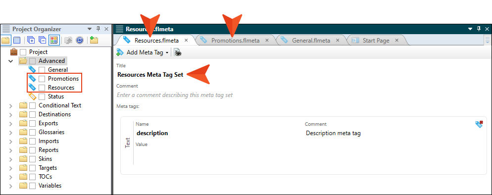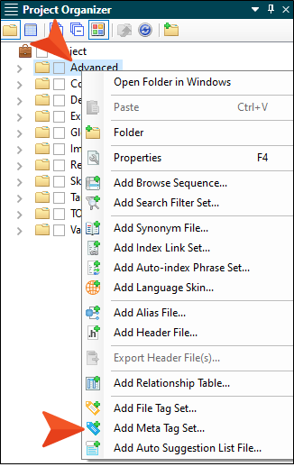 In the Project Organizer, right-click the Advanced folder and select Add Meta Tag Set.