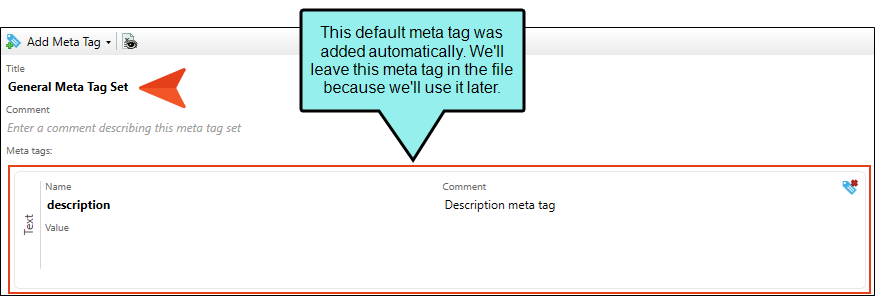 - In the File Name field, enter General and click Add. The Meta Tag Set Editor opens to the right with one meta tag (named "description") already added for you.