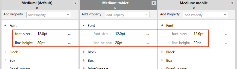7. Expand different property groups in the media query window panes. Notice how the styles are initially inherited from the default medium.