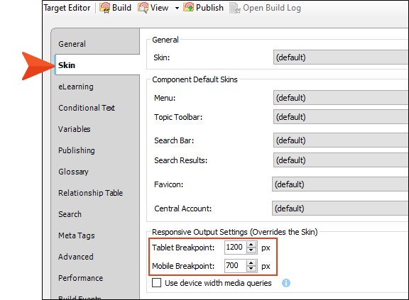 Note Notice the option for Use device width media queries. This means that the responsive nature of the skin depends on the device being used to view the output (browser, tablet, or mobile phone), rather than on merely the width of the screen. See Responsive Skins.
