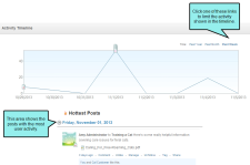 Select Pulse > Timeline to open the Activity Timeline page. This shows a list of Pulse activity in chronological order. You can click the links at the top right-side of the page to limit the activity shown in the timeline to the Past Year, Past Month, or Past Week. The posts with the most user activity appear under Hottest Posts.