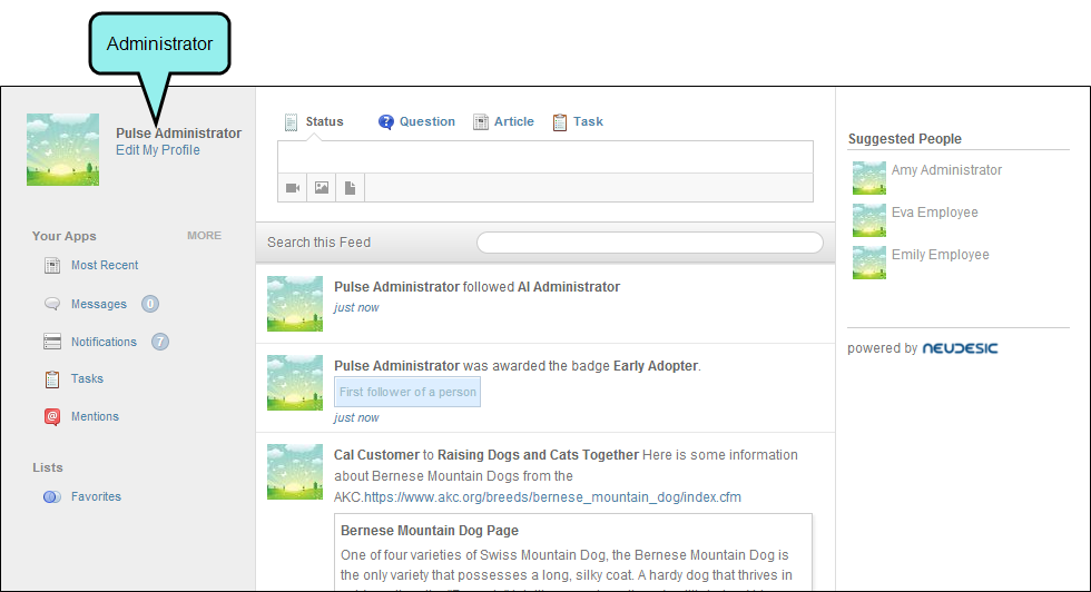Select Pulse > Home to open your personalized Home page. The options available to you in the Home page depend on your user account's group membership. See Managing Groups.