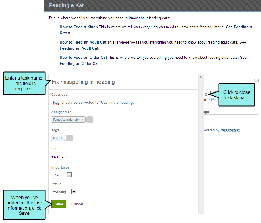 All registered users can create, assign, and manage tasks with Pulse. This gives members of the Customers group the ability to assign a task to any other registered user. It also gives members of the Administrators and Employees groups the ability to assign tasks to each other in any topic, group, tag, and user feed that you have access permission to view.